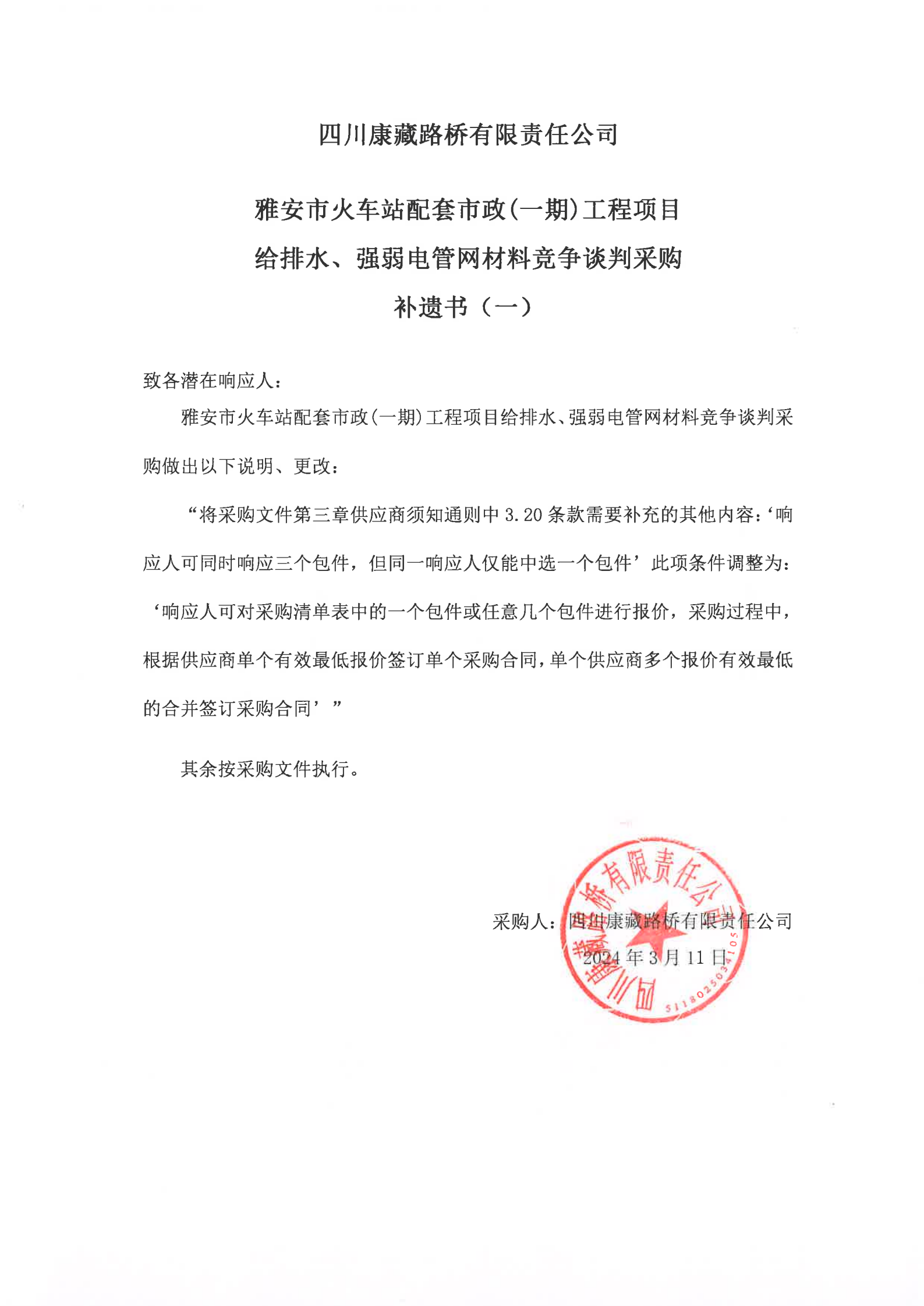 四川康藏路橋有限責(zé)任公司雅安市火車(chē)站配套市政(一期)工程項(xiàng)目給排水、強(qiáng)弱電管網(wǎng)材料競(jìng)爭(zhēng)談判采購(gòu)補(bǔ)遺書(shū)