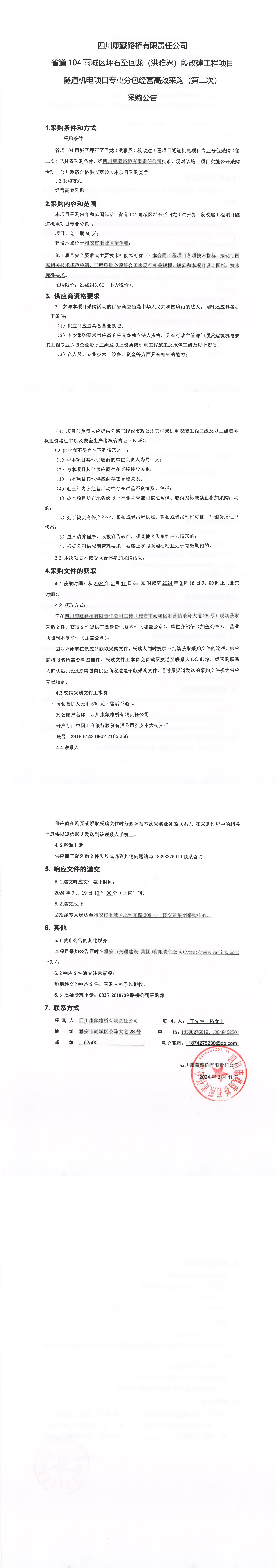 四川康藏路橋有限責任公司省道104雨城區(qū)坪石至回龍(洪雅界)段改建工程項目隧道機電項目專業(yè)分包經(jīng)營高效采購(第二次)采購公告