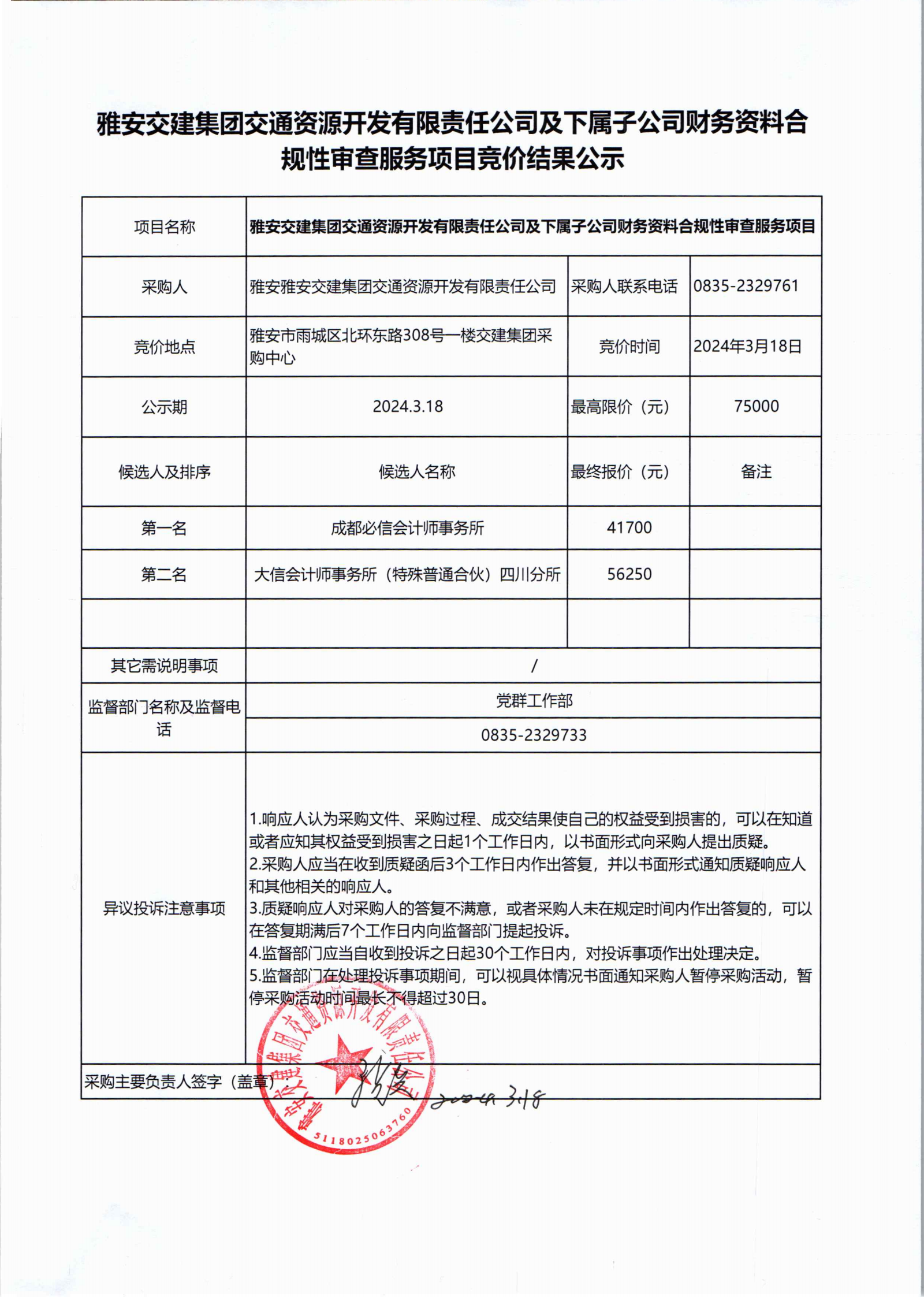 雅安交建集團(tuán)交通資源開發(fā)有限責(zé)任公司及下屬子公司財(cái)務(wù)資料合規(guī)性審查服務(wù)項(xiàng)目競價(jià)結(jié)果公示