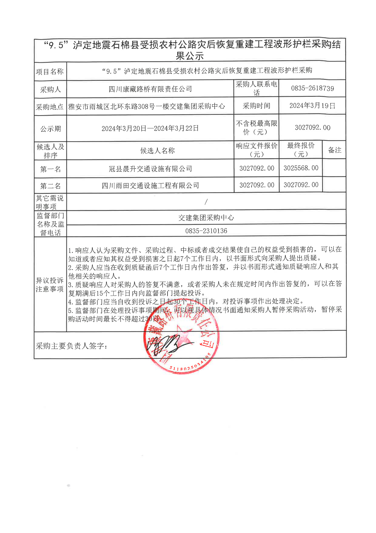 四川康藏路橋有限責任公司“9.5”瀘定地震石棉縣受損農村公路災后恢復重建工程波形護欄采購結果公示