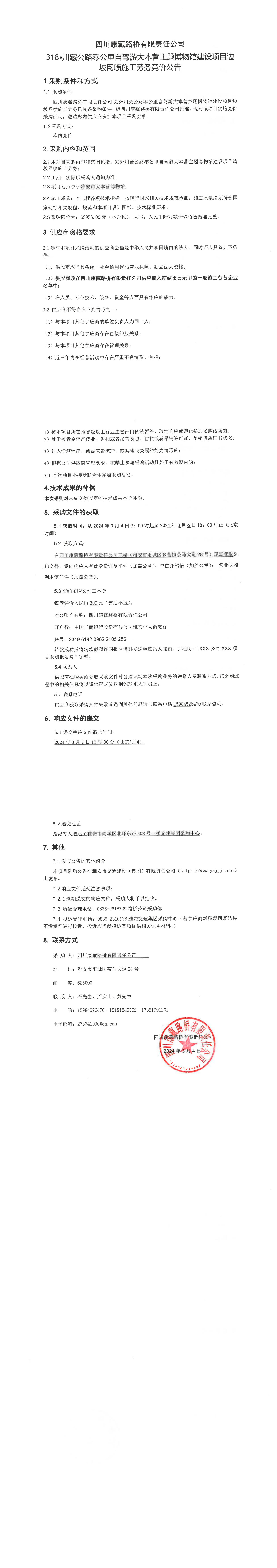 四川康藏路橋有限責任公司318·川藏公路零公里自駕游大本營主題博物館建設項目邊坡網(wǎng)噴施工勞務競價公告