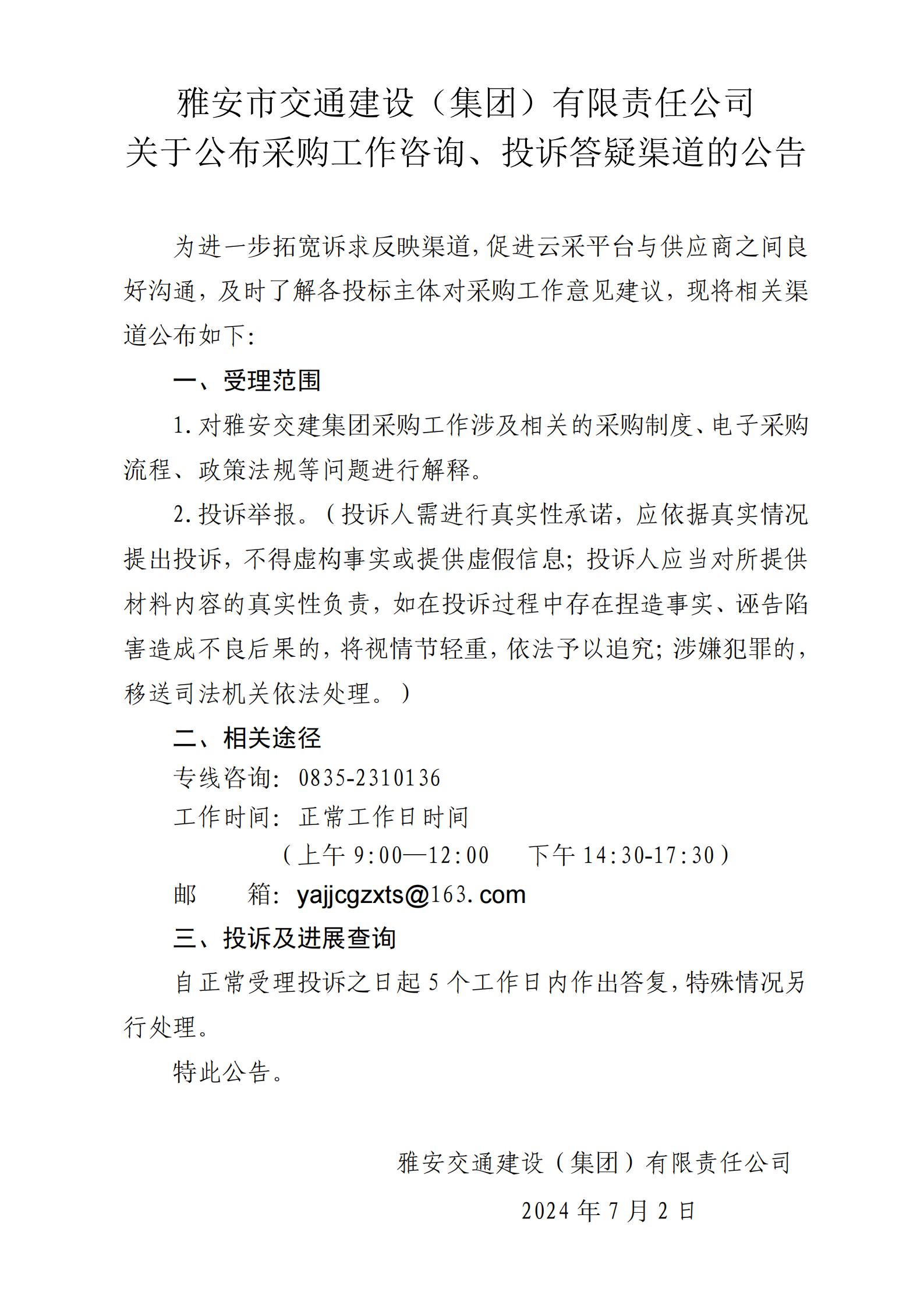 雅安市交通建設(集團)有限責任公司關(guān)于公布采購工作咨詢、投訴答疑渠道的公告