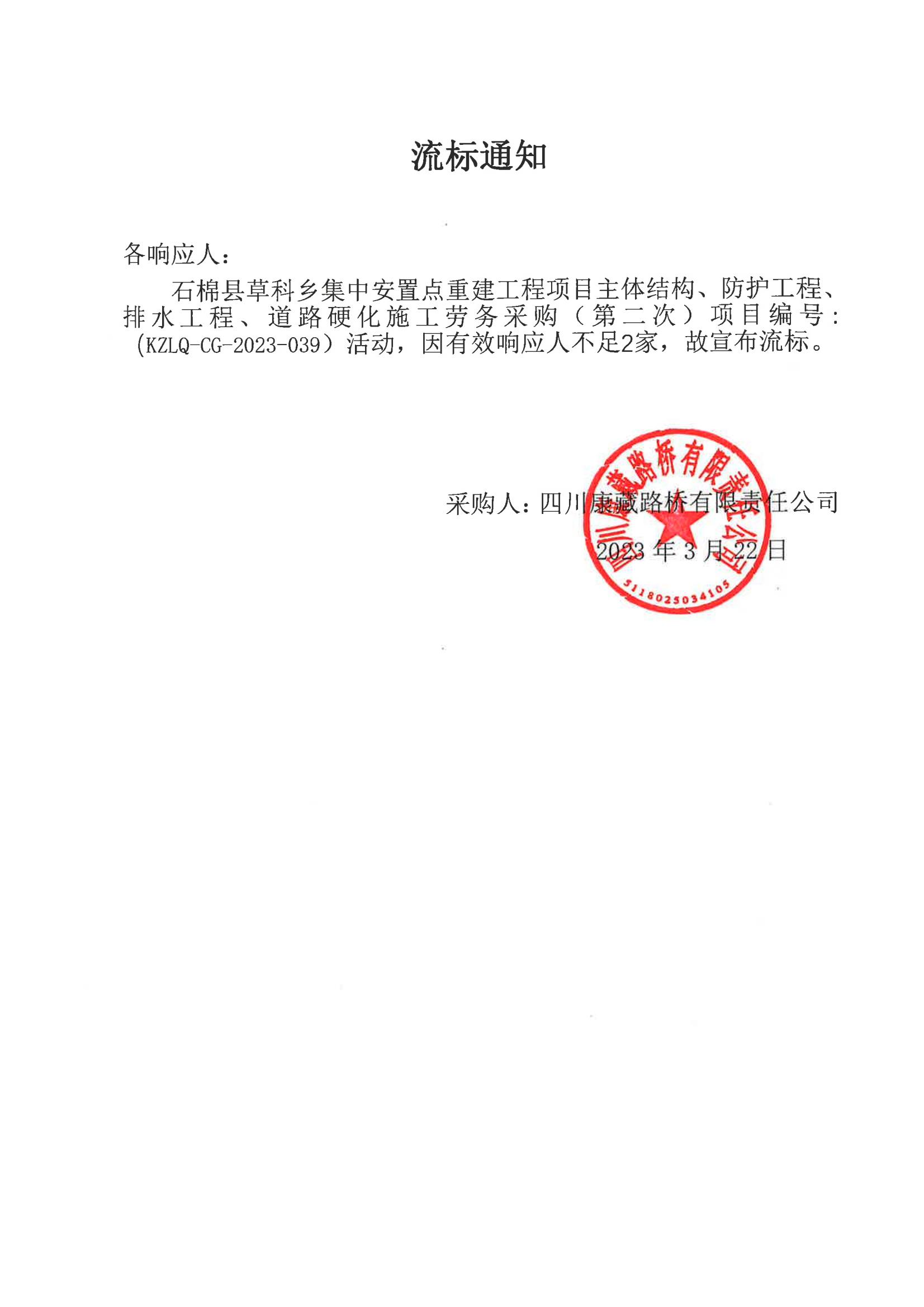 四川康藏路橋有限責任公司石棉草科鄉(xiāng)集中安置點重建工程項目主體結構、防護工程、排水工程、道路硬化施工勞務采購流標通知(第二次)