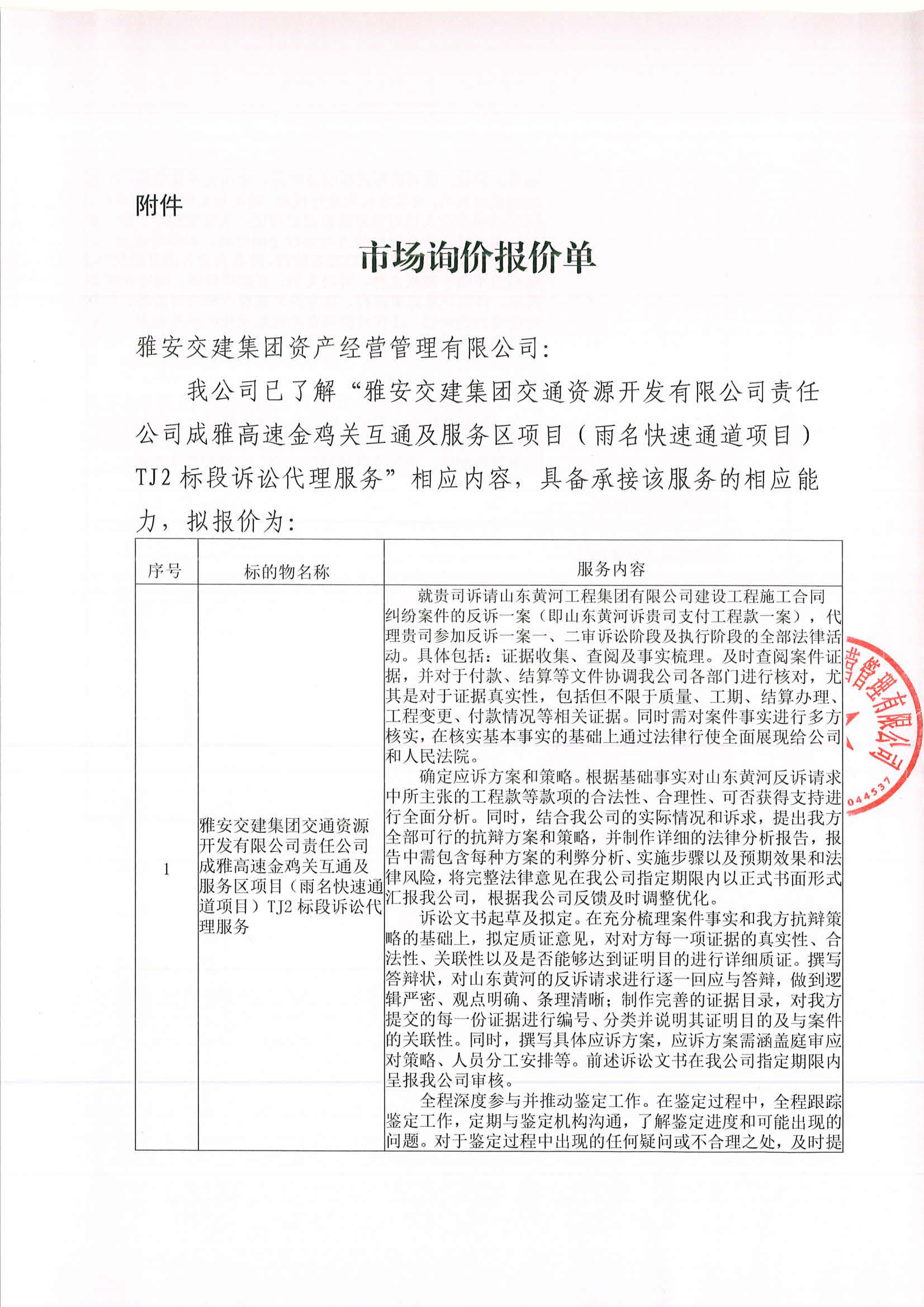 雅安交建集團(tuán)資產(chǎn)經(jīng)營(yíng)管理有限公司成雅高速金雞關(guān)互通及服務(wù)區(qū)項(xiàng)目(雨名快速通道項(xiàng)目)TJ2標(biāo)段訴訟代理服務(wù)項(xiàng)目市場(chǎng)調(diào)查公告