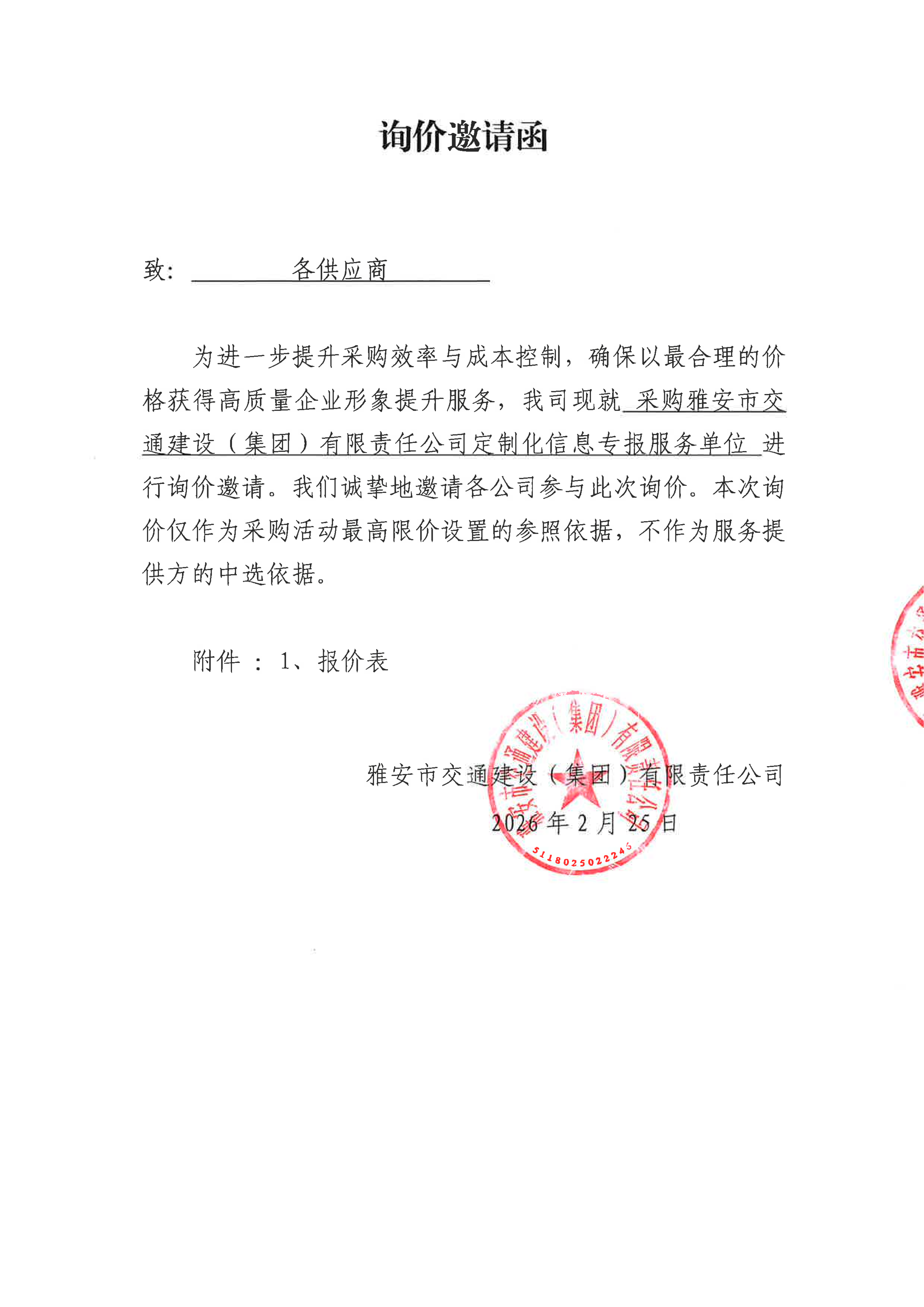 關(guān)于雅安市交通建設(shè)(集團)有限責(zé)任公司定制化信息專報服務(wù)采購限價的詢價函