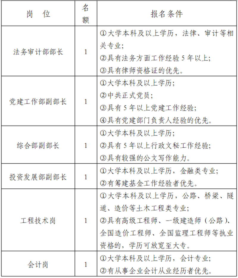 雅安市交建集團是市屬重點國有企業(yè),主要從事交通基礎設施及配套服務設施的投資、建設、經(jīng)營和交通資源的開發(fā)利用等業(yè)務。根據(jù)公司發(fā)展需要,決定面向社會公開招聘6名工作人員,現(xiàn)將有關事項公告如下: