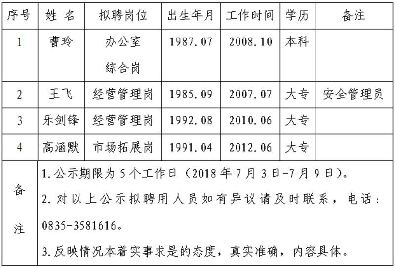 通過(guò)公開報(bào)名、資格審查、面試等程序,經(jīng)公司研究確定以下4名擬聘用人員,現(xiàn)公示名單如下:
