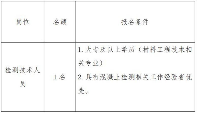 雅安交建集團康居建設工程質(zhì)量與室內(nèi)環(huán)境污染檢測有限公司是雅安市交通建設(集團)有限責任公司下屬子公司,主要從事民用建筑室內(nèi)環(huán)境污染檢測業(yè)務。現(xiàn)根據(jù)公司業(yè)務發(fā)展需要,擬向社會公開招聘1名技術(shù)檢測人員,現(xiàn)將有關(guān)事項公告如下: