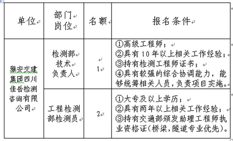 雅安交建集團關(guān)于公開招聘所屬子公司工作人員的公告(佳岳檢測公司)