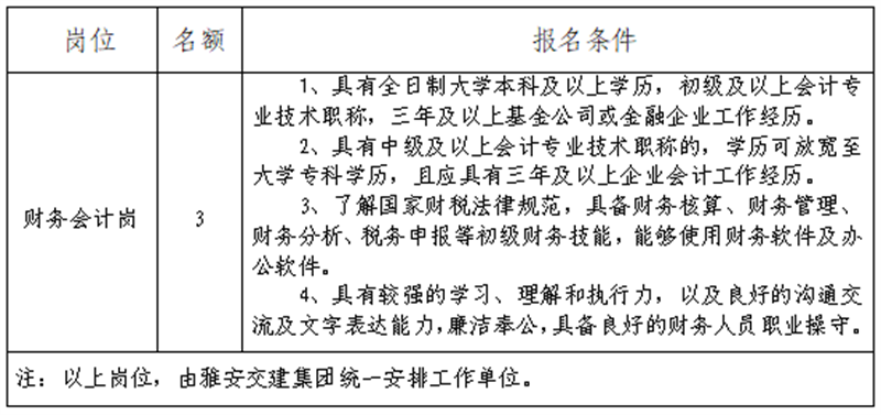 根據(jù)發(fā)展需要,決定面向社會(huì)公開(kāi)招聘雅安市交通建設(shè)(集團(tuán))有限責(zé)任公司(以下簡(jiǎn)稱(chēng)“雅安交建集團(tuán)”)所屬子公司財(cái)務(wù)工作人員3名,現(xiàn)將有關(guān)事項(xiàng)公告如下: