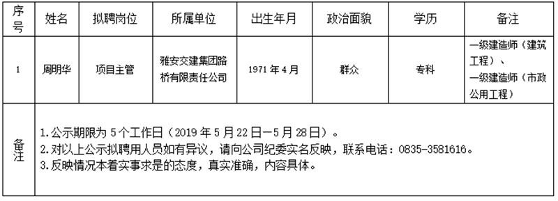 雅安交建集團(tuán)子公司擬聘用人員公示(路橋公司)