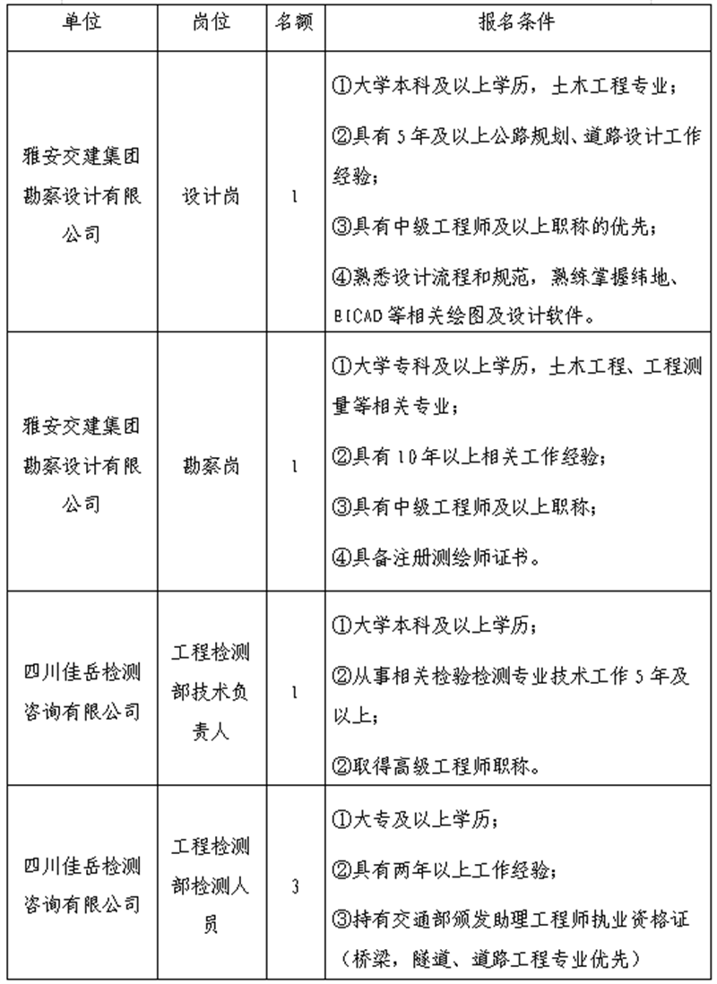 根據(jù)發(fā)展需要,決定面向社會公開招聘雅安市交通建設(shè)(集團)有限責(zé)任公司(以下簡稱“雅安交建集團”)所屬子公司工作人員6名,現(xiàn)將有關(guān)事項公告如下: