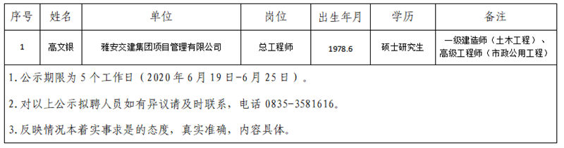 雅安市交通建設(集團)有限責任公司擬聘用人員公示(項目管理公司人才引進)