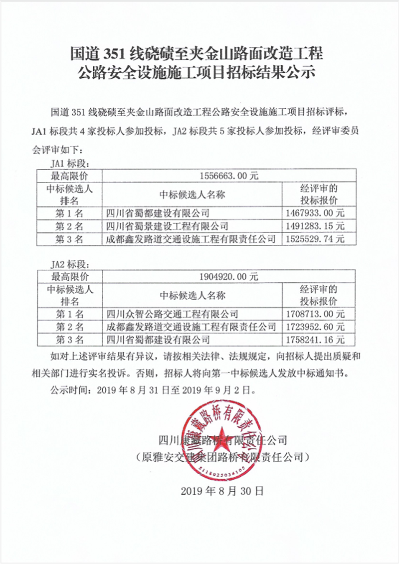 國道351線磽磧至夾金山路面改造工程公路安全設施施工項目招標結果公示