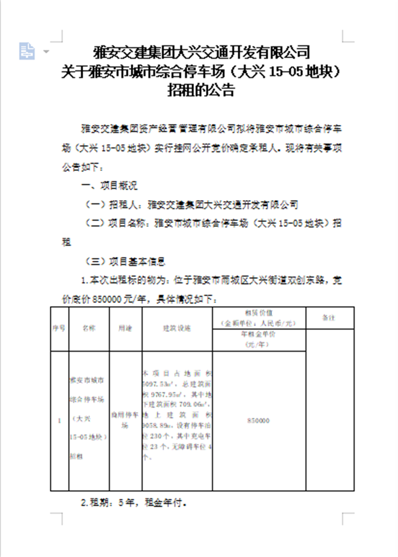 雅安交建集團(tuán)大興交通開發(fā)有限公司關(guān)于雅安市城市綜合停車場(大興15-05地塊)招租的公告