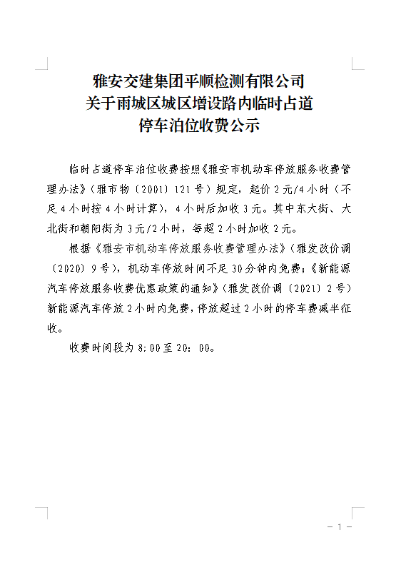 雅安交建集團平順檢測有限公司關于雨城區(qū)城區(qū)增設路內臨時占道停車泊位收費公示