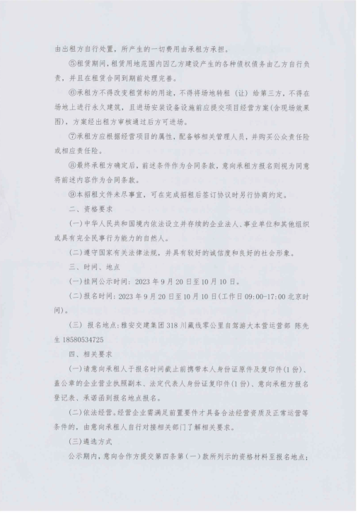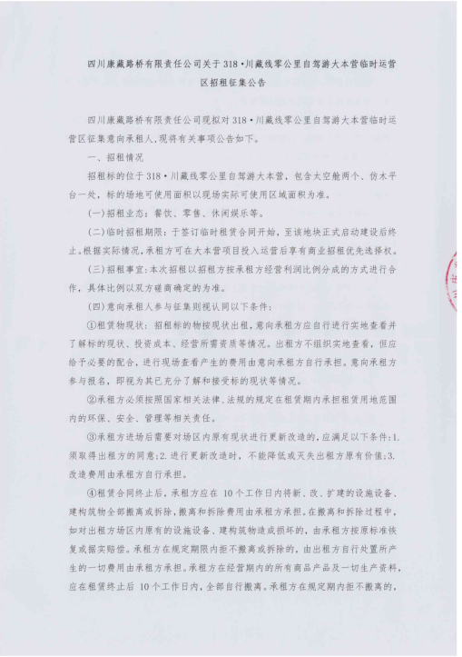 四川康藏路橋有限責(zé)任公司318·川藏線零公里自駕游大本營(yíng)臨時(shí)用地臨時(shí)招租征集公告
