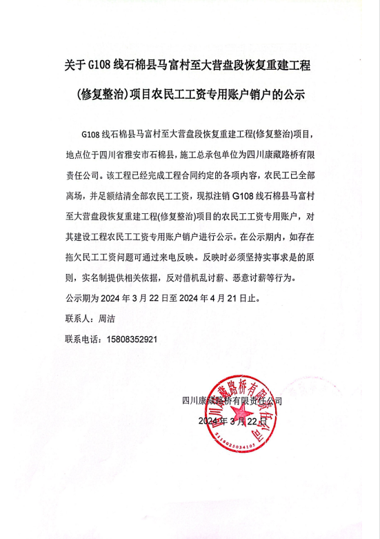 關(guān)于G108線石棉縣馬富村至大營(yíng)盤(pán)段恢復(fù)重建工程(修復(fù)整治)項(xiàng)目農(nóng)民工工資專用賬戶銷(xiāo)戶的公示