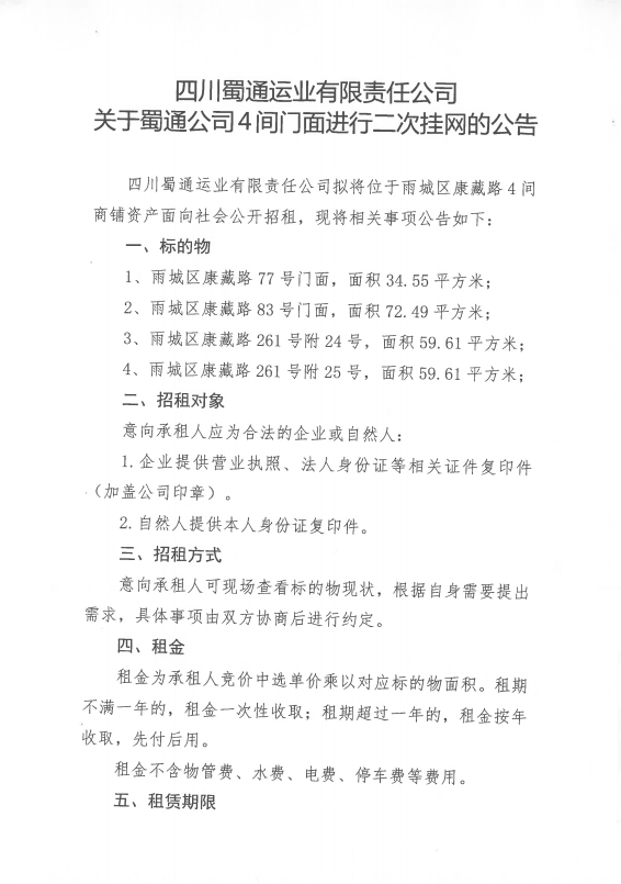 四川蜀通運(yùn)業(yè)有限責(zé)任公司關(guān)于蜀通公司4間門面進(jìn)行二次掛網(wǎng)的公告