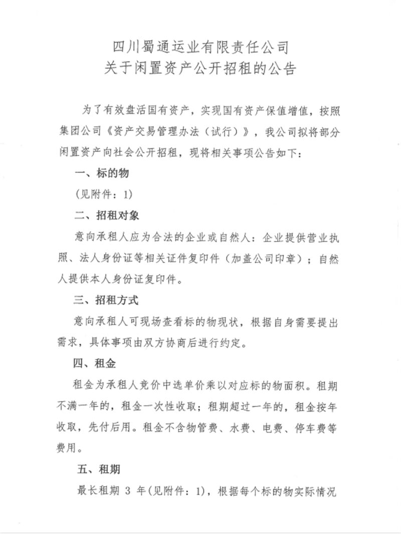蜀通運(yùn)業(yè)有限責(zé)任公司關(guān)于閑置資產(chǎn)公開(kāi)招租的公告附件