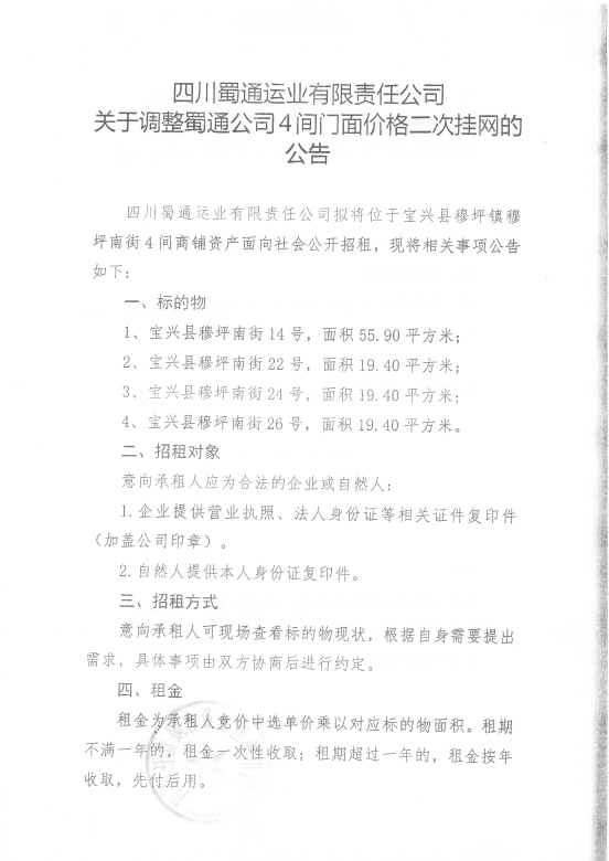 四川蜀通運業(yè)有限責(zé)任公司關(guān)于調(diào)整蜀通公司4間門面價格二次掛網(wǎng)的公告