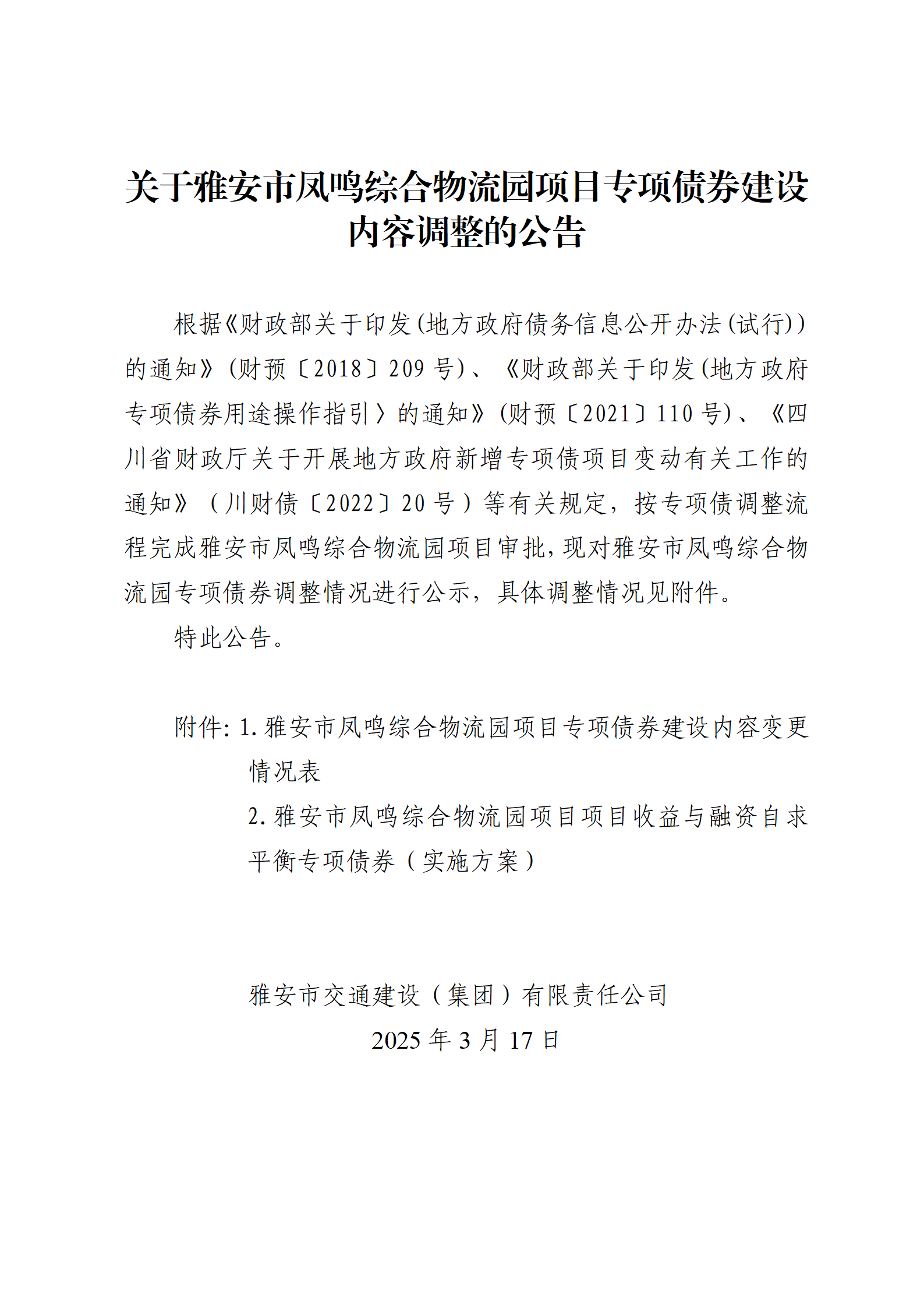 關于雅安市鳳鳴綜合物流園項目專項債券建設內(nèi)容調(diào)整的公告