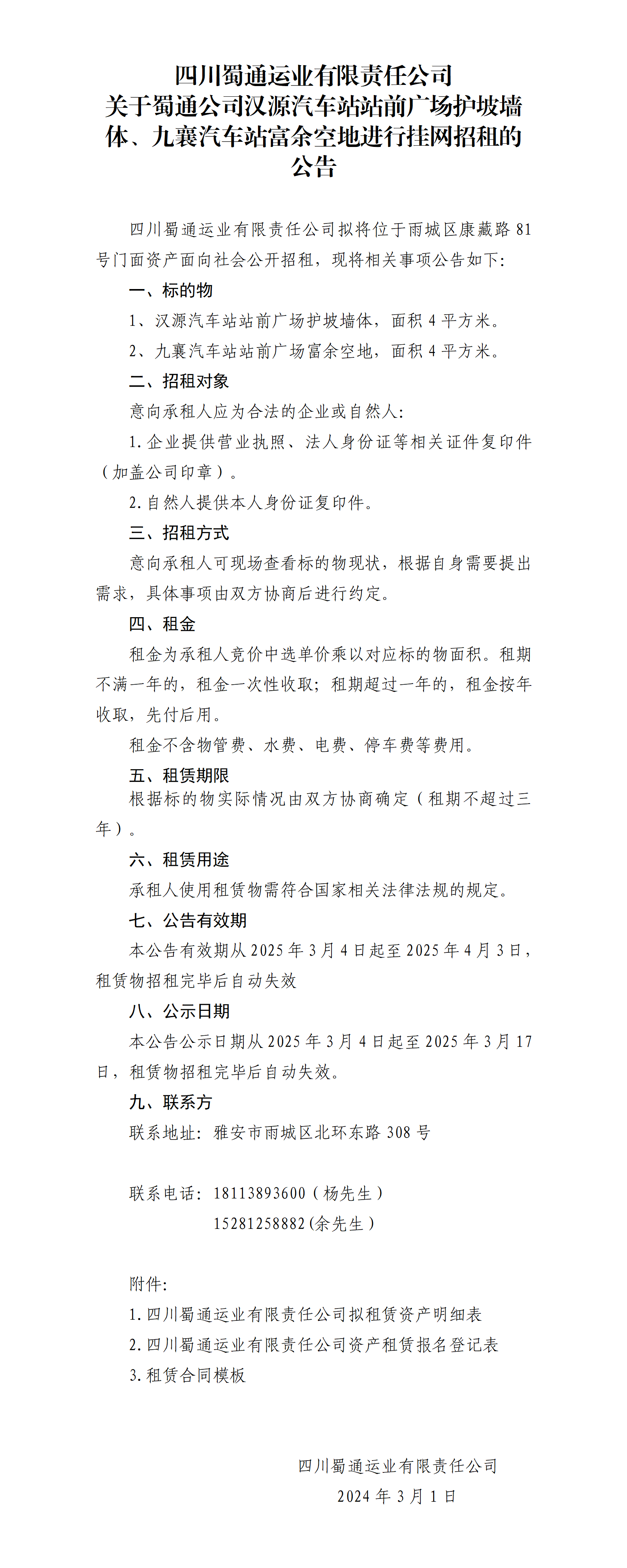 四川蜀通運(yùn)業(yè)有限責(zé)任公司 關(guān)于蜀通公司漢源汽車站站前廣場(chǎng)護(hù)坡墻體、九襄汽車站富余空地進(jìn)行掛網(wǎng)招租的公告