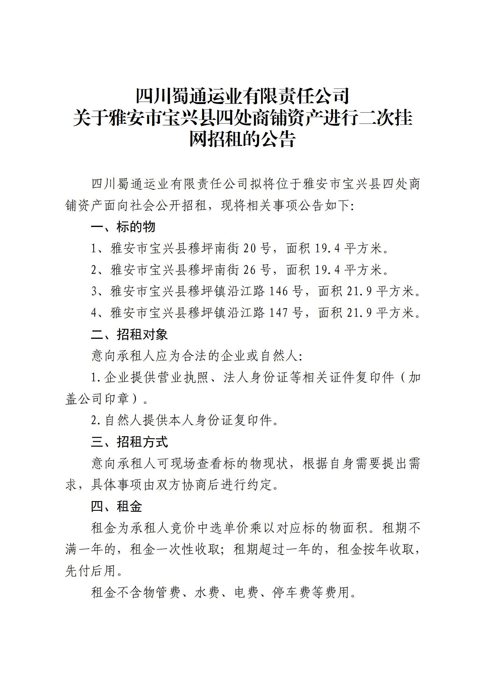 四川蜀通運業(yè)有限責(zé)任公司 關(guān)于雅安市寶興縣四處商鋪資產(chǎn)進(jìn)行二次掛網(wǎng)招租的公告