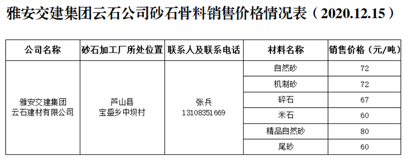雅安交建集團云石公司砂石骨料銷售價格情況表(2020.12.15)