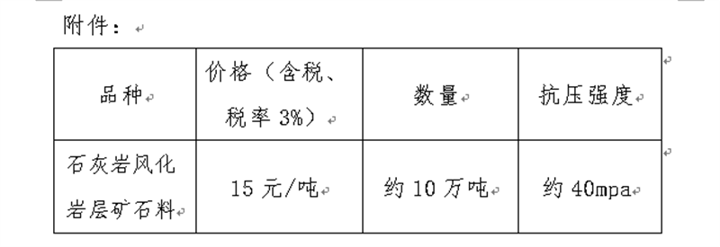 現(xiàn)將我公司礦山首采平臺的石灰?guī)r風(fēng)化巖層礦石料定價出售事宜進(jìn)行公示(見附件),經(jīng)公司研究決定,定價出售風(fēng)化巖層礦石料約10萬噸,現(xiàn)通過集團(tuán)公司官網(wǎng)信息公示后對外銷售。報名客戶數(shù)不限,銷售方式為先款后貨,簽約銷售,銷售時間以礦山開采和生產(chǎn)計(jì)劃為準(zhǔn)。