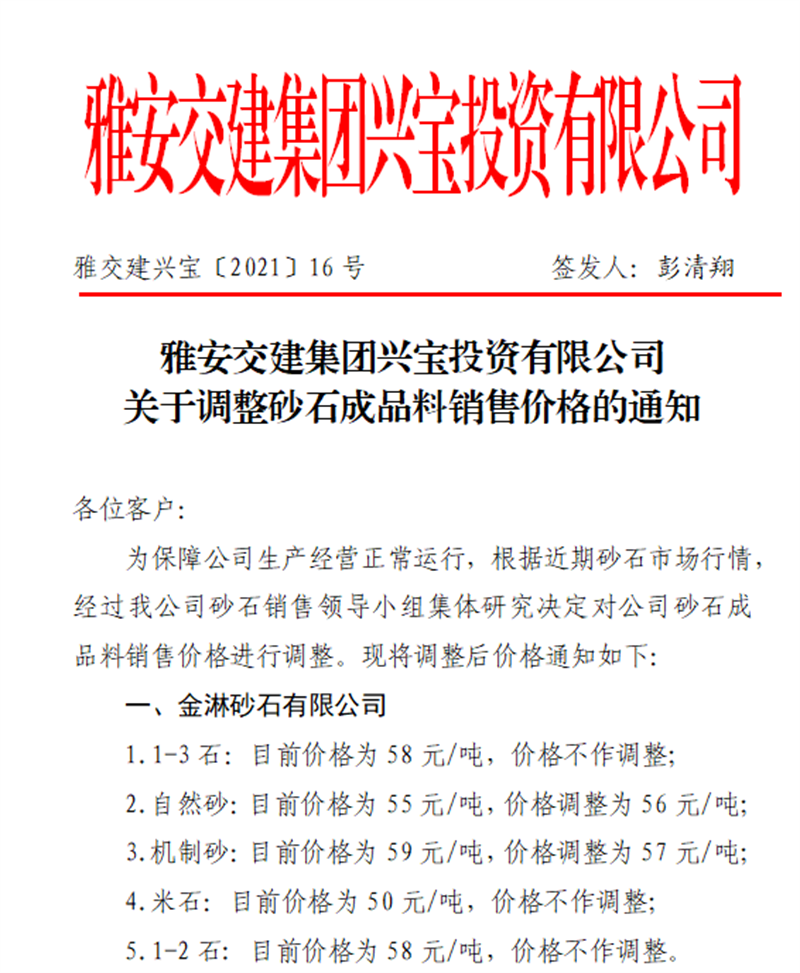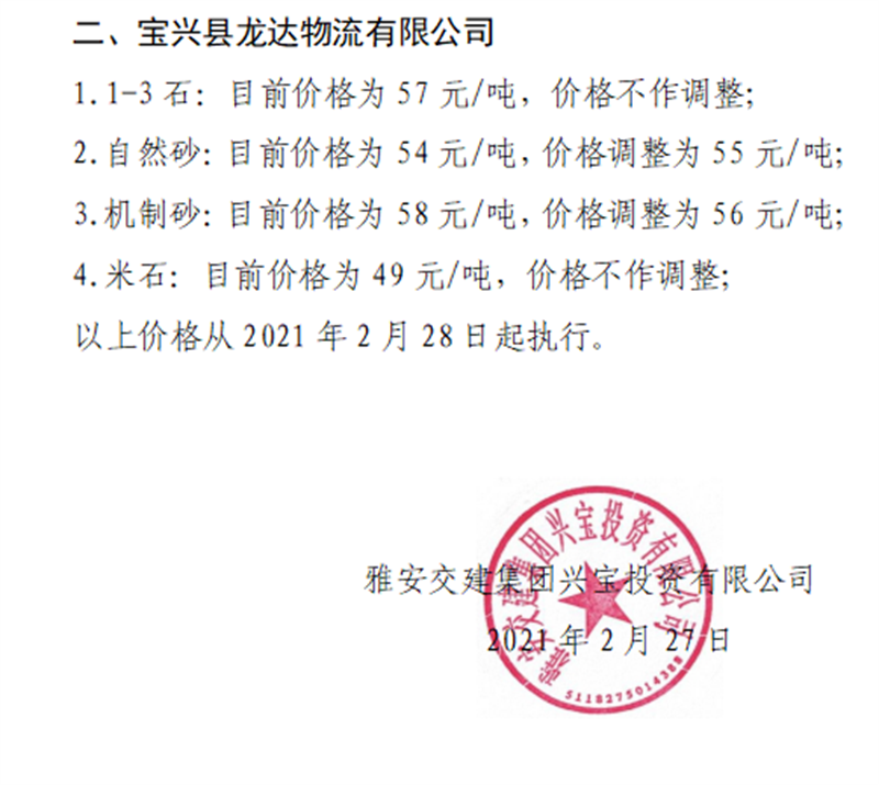 雅安交建集團興寶公司砂石骨料銷售價格情況表(2021.2.28)