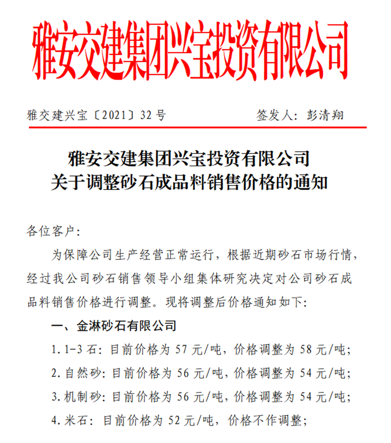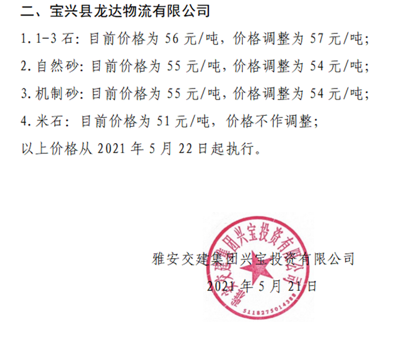 雅安交建集團(tuán)興寶公司砂石骨料銷售價(jià)格情況表(2021.5.22)