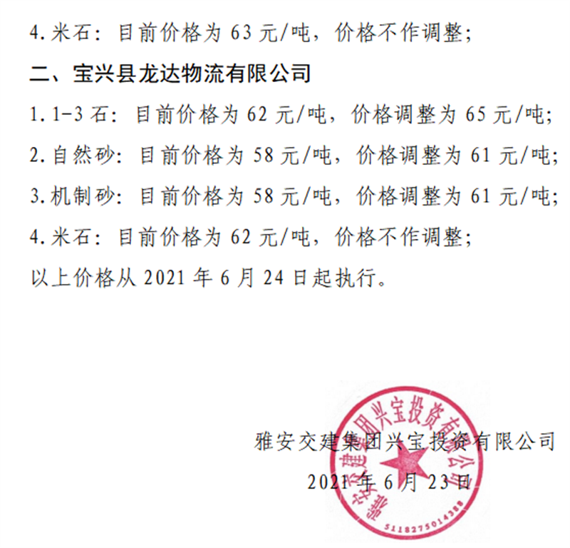 雅安交建集團興寶公司砂石骨料銷售價格情況表(2021.6.23)