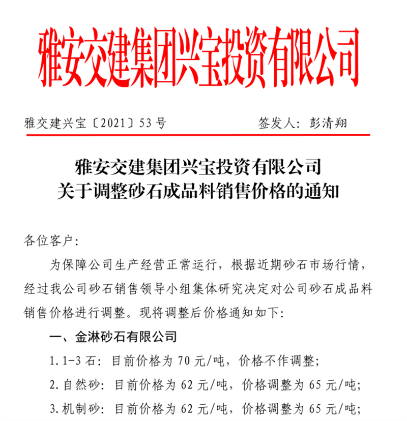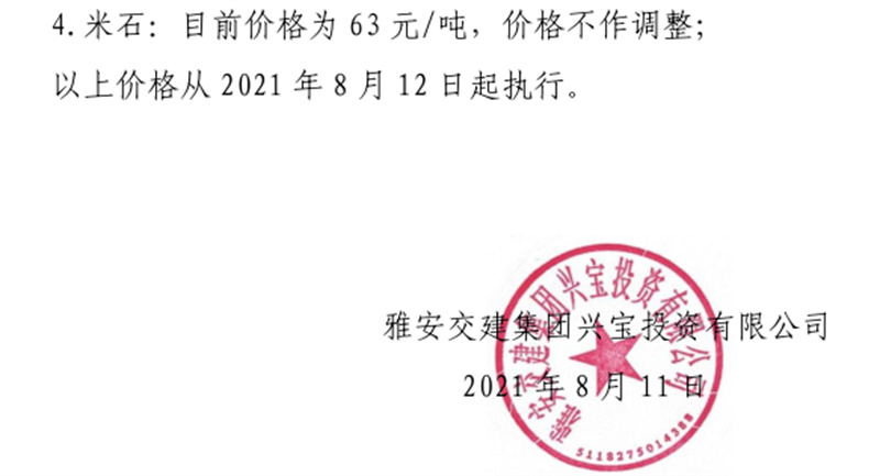 雅安交建集團興寶公司砂石骨料銷售價格情況表(2021.8.12)