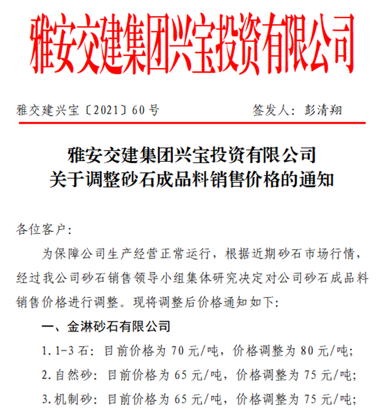 雅安交建集團(tuán)云石公司關(guān)于調(diào)整成品料銷售價(jià)格的通知(2021.11.4)