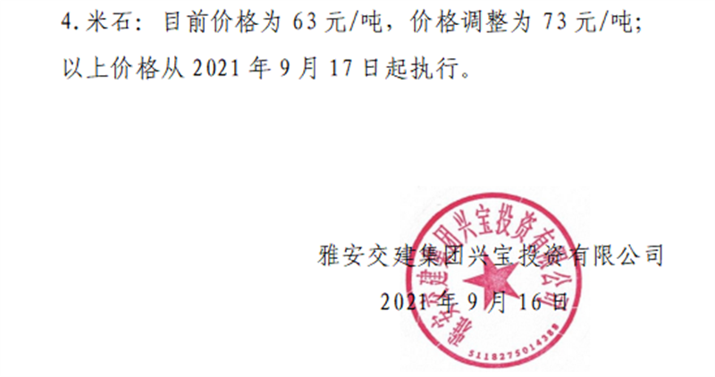 雅安交建集團(tuán)云石公司關(guān)于調(diào)整成品料銷售價(jià)格的通知(2021.9.13)