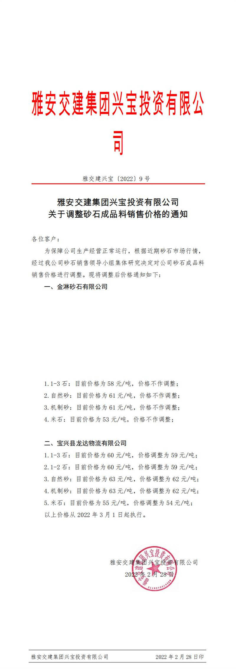 ÑŰ²½»½¨ÅdŒš¹«Ë¾êP(gu¨¡n)ÓÚÕ{(di¨¤o)Õûɰʯ³ÉÆ·ÁÏäNÊÛƒr(ji¨¤)¸ñµÄ֪ͨ£¨2022-3-1£©