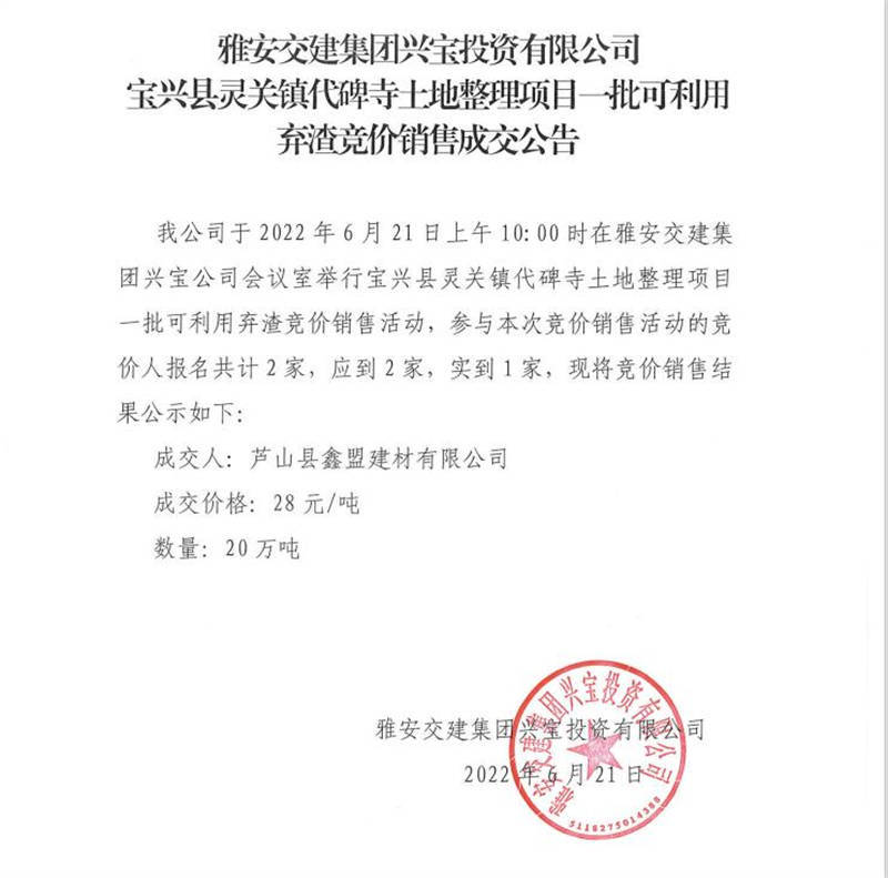雅安交建集團(tuán)興寶投資有限公司寶興縣靈關(guān)鎮(zhèn)代碑寺土地整理項(xiàng)目-批可利用 棄渣競價(jià)銷售公告( 2022.6.21)
