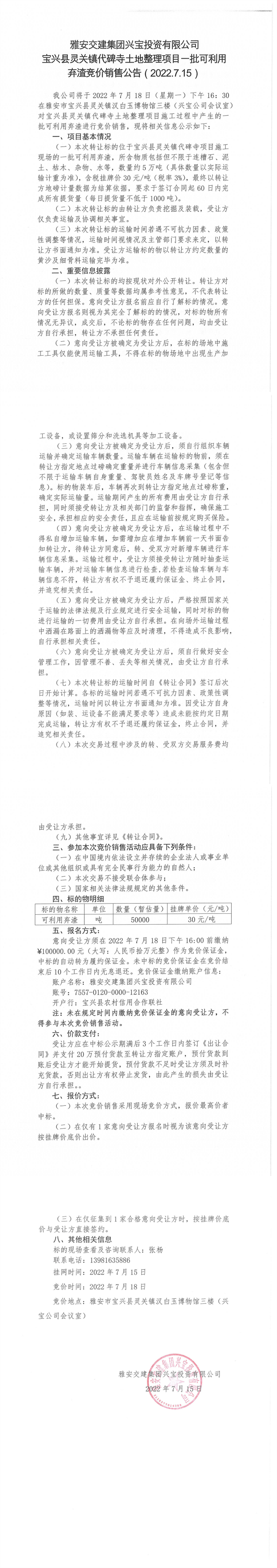 寶興縣靈關(guān)鎮(zhèn)代碑寺土地整理項(xiàng)目一批可利用棄渣競價銷售公告7.15(5萬噸)