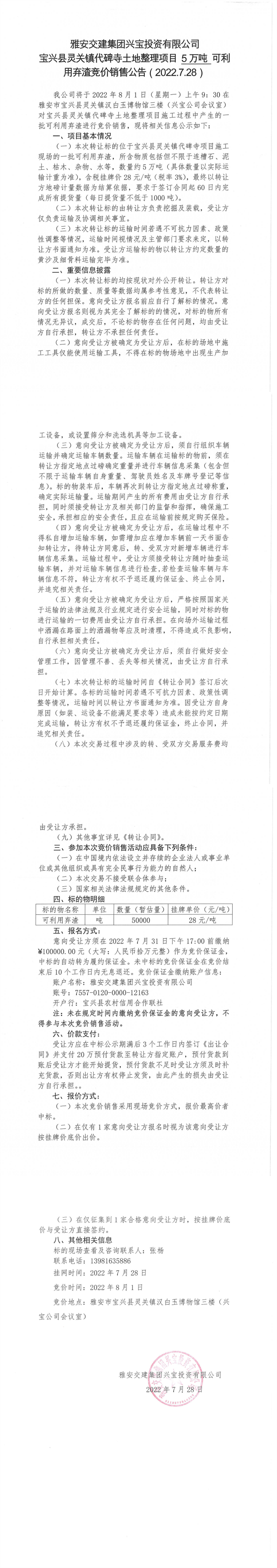 雅安交建集團(tuán)興寶投資有限公司靈關(guān)鎮(zhèn)代碑寺土地整理項(xiàng)目5萬噸可利用棄渣競價(jià)銷售公告(2022.7.28)