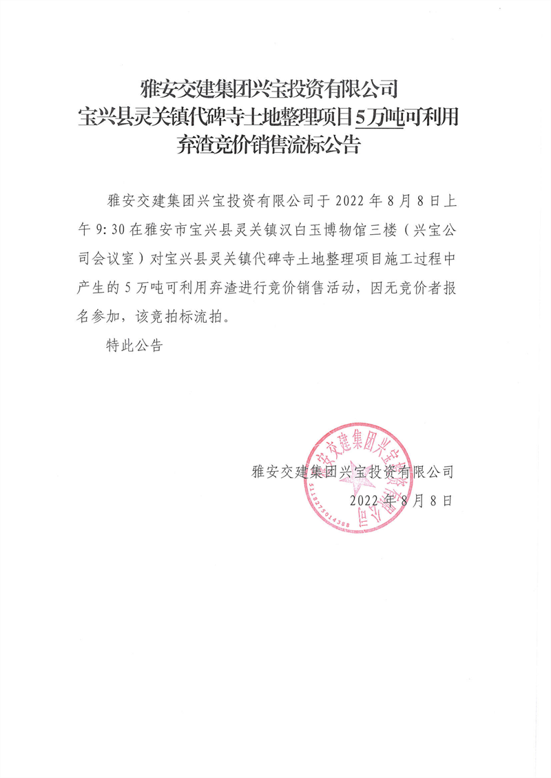 代碑寺土地整理項目5萬噸可利用棄渣競價銷售流標公告