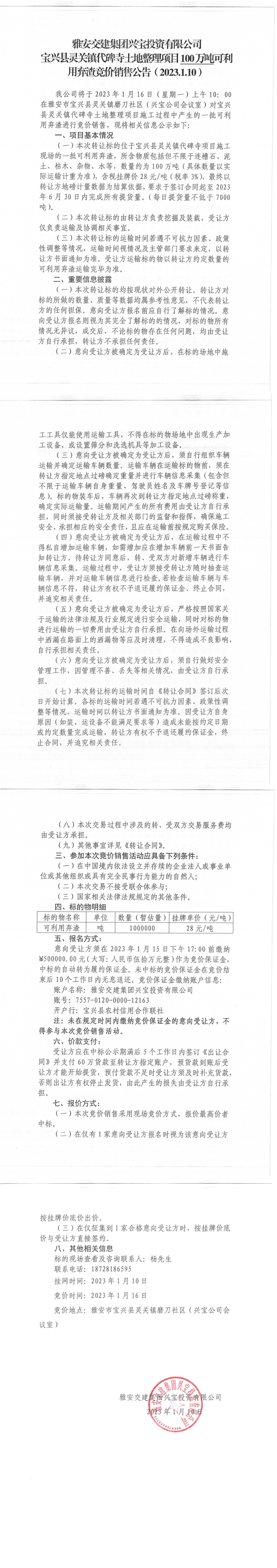 雅安交建集團(tuán)興寶投資有限公司靈關(guān)鎮(zhèn)代碑寺土地整理項目100萬噸可利用棄渣競價銷售公告(2023.1.10)