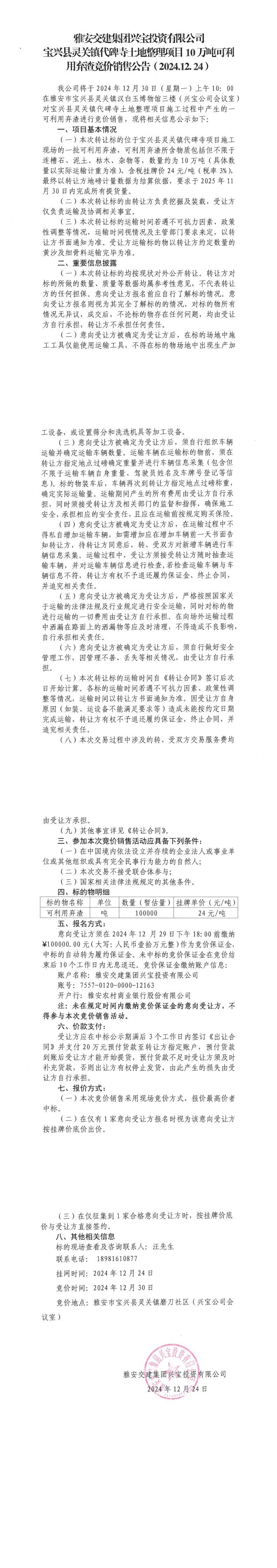 雅安交建集團興寶投資有限公司靈關鎮(zhèn)代碑寺土地整理項目10萬噸可利用棄渣競價銷售公告(2024.12.24)