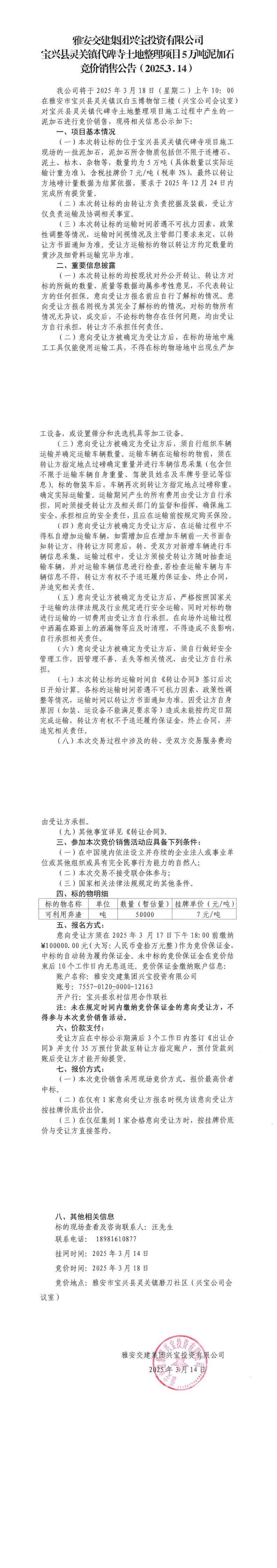 雅安交建集團(tuán)興寶投資有限公司寶興縣靈關(guān)鎮(zhèn)代碑寺土地整理項(xiàng)目5萬(wàn)噸泥加石競(jìng)價(jià)銷(xiāo)售公告(2025.03.14)